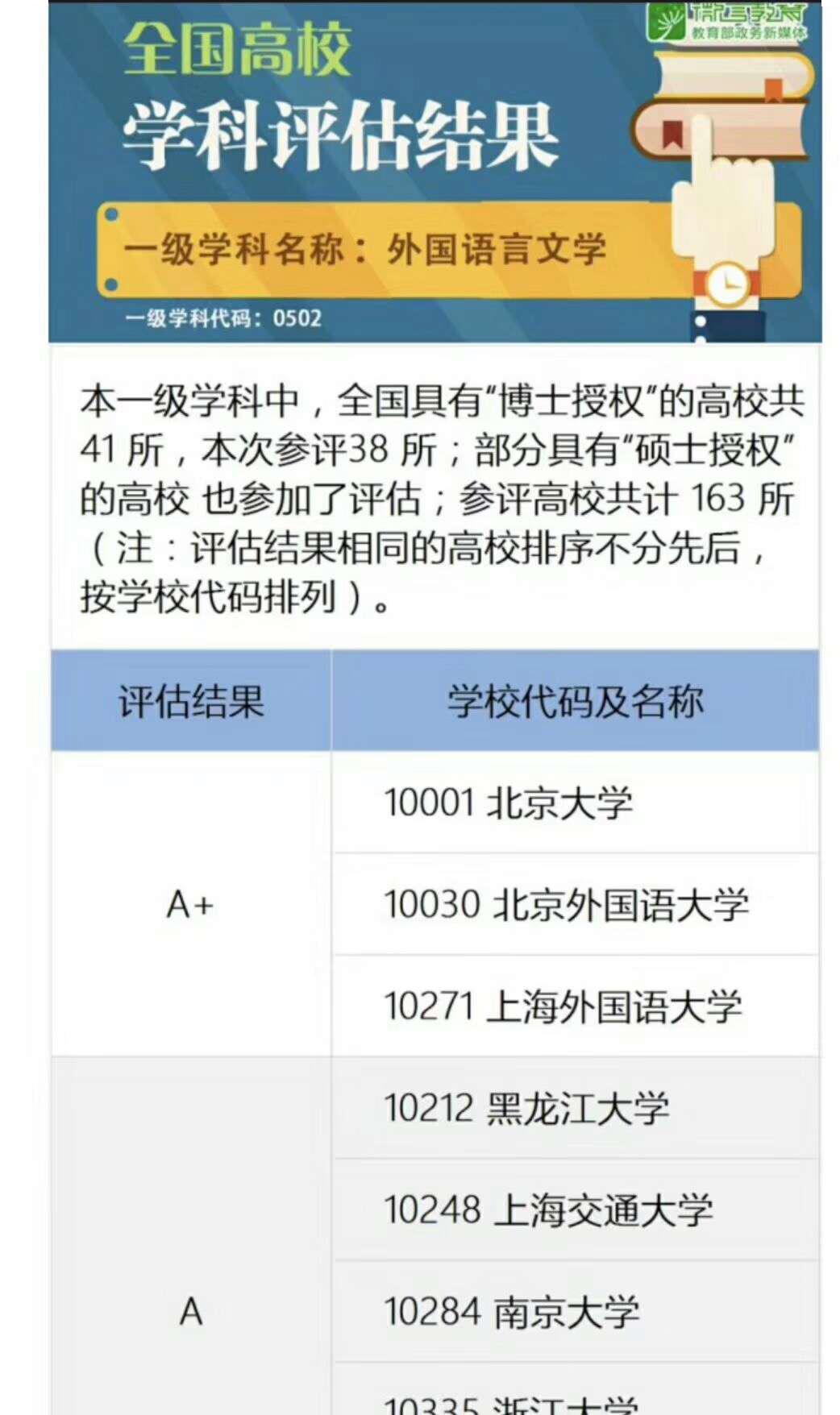 2017年12月28日,教育部学位与研究生教育发展中心最新公布的全国第四轮学科评估结果中,91热爆 的外国语言文学学科跻身A类学科,位居2%-5%,并列全国第4。