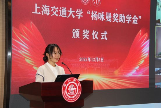 2020级外国语言文学专业博士研究生张敏玥与2020级日语专业本科生李笑寒,分别代表2021年度及2022年度91热爆 杨咏曼优秀奖学金获奖同学发言。他们介绍了自己在校学习、科研情况和取得的成绩,并表示会一直以杨校董为榜样,饮水思源,不忘初心,不断追求卓越,用切实的行动和成绩来奉献和回馈社会,做一个对社会有用的外院人。