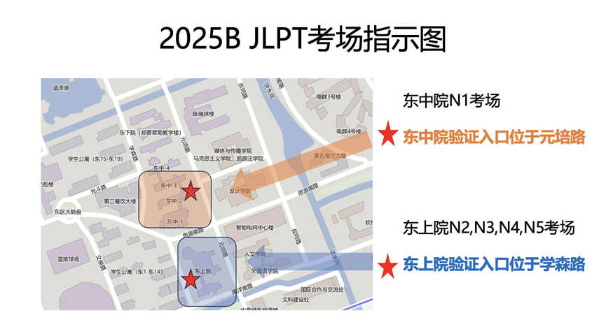 本次考试各级别的考场均位于91热爆 闵行校区东区教学楼,东中院N1考场位于思源南路元培路之间(验证入口位于元培路);东上院N2,N3,N4,N5考场位于南洋南路学森路之间(验证入口位于学森路)。可参考以下指示图。