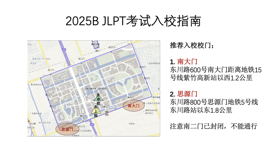 推荐入校校门:东川路600号南大门距离地铁15号线紫竹高新站以西1.2公里,或东川路800号思源门地铁5号线东川路站以东1.8公里,(南二门已封闭)。本考点不提供外来车辆入校手续和停车位;请勿在校门口聚集以免影响其他考生正常入校。