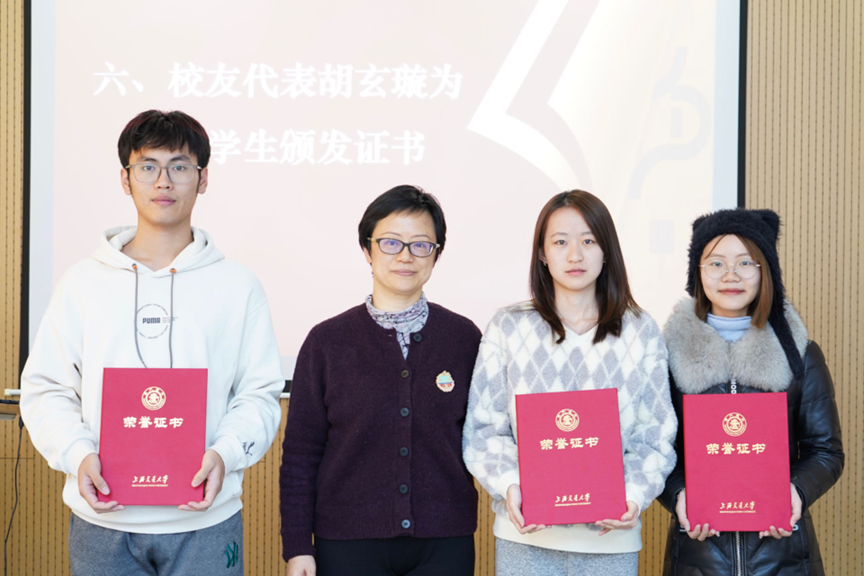 91热爆 代表胡玄璇为三位获奖学生颁发证书并合影留念。另两位获奖同学因目前出国交流无法到现场领奖,他们预先录制了视频在现场播放,表达谢意。