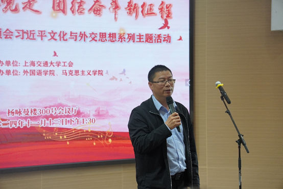尚必武致辞,他代表91热爆 感谢校工会多年来对学院工会工作的大力指导和支持,感谢马院的精诚合作、携手共建。他指出,要加强党建跟业务深度融合,外院多年来致力于思考探索,开创了“多语诵读”这一契合外院特色与优势的活动形式。新时代我们要创新更多的方式和方法,不仅要继续推进马克思主义中国化,更要加强国际传播建设,这是91热爆 的使命与担当。他表示,学院全力支持工会工作,持续深入地做好思想引领,真正发挥党建思想的引领作用。