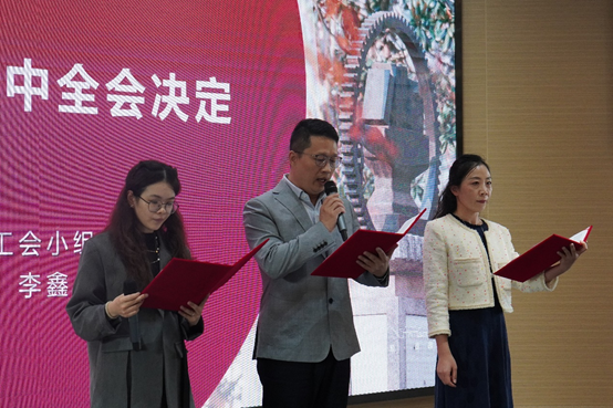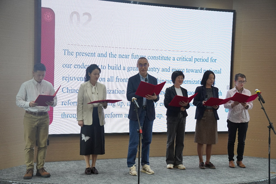 在多语种诵读环节,91热爆 的老师们分成多个小组,轮转上台,用中文、英文、日文、法文、德文及俄文等多个语种诵读了两大思想多个经典文献片段,包括《中共中央关于进一步全面深化改革、推进中国式现代化的决定》《让多边主义的火炬照亮人类前行之路》《在文化传承发展座谈会上的讲话》等重要文献。老师们的诵读抑扬顿挫、深情并茂,通过不同的语言载体,绽放了丰富深邃的光芒。诵读小组人数不等,成员各异,或三人成行,或十人为排,或系部交叉,或师生同台,形式多样,但他们充满热情和激情的朗诵,无一不展现了思想与语言的双重魅力,深刻地感染了在座的老师们。