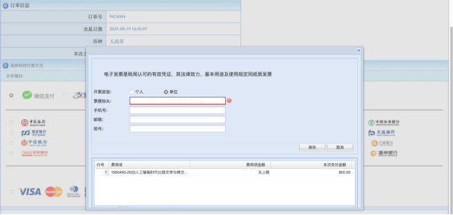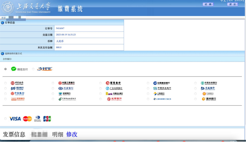 点击支付方式(微信或支付宝)或银行名称,并在左下角填入发票信息