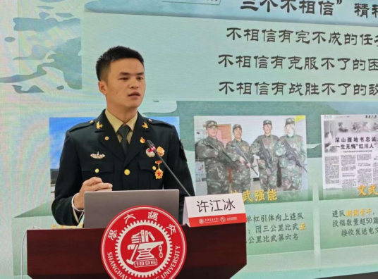 退役大学生士兵许江冰以“书写绚烂青春:从思源湖畔到绿色军营”为题分享军旅历程。他用亲身经历阐释了“三个不相信”——不相信有完不成的任务,不相信有克服不了的困难,不相信有战胜不了的敌人的战斗精神,并鼓励新生突破自我、凝聚集体力量。随后,他从国家征兵政策、报名流程等方面进行了详细讲解,号召有志青年在献身国防中绽放光彩。