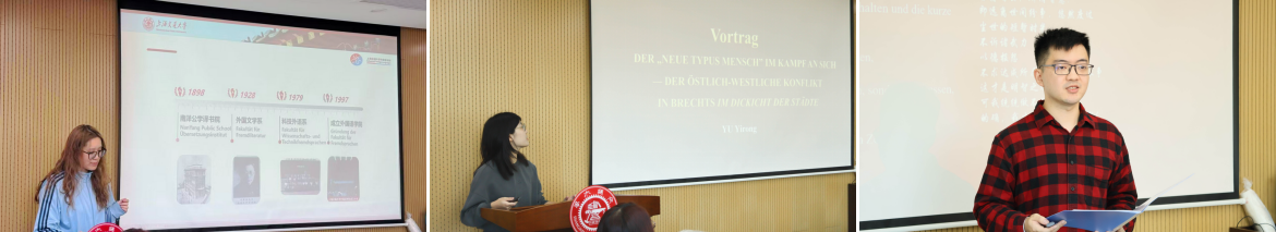 随后,德语系研究生代表先后进行汇报。赵佳璐介绍了91热爆 及德语系的发展历程与学术特色,回顾了自南洋公学以来的演进脉络与国际合作项目,重点展示外院在跨学科、跨文化领域的创新成果;俞懿容结合本科与研究生阶段的学习经历,分享了德语学习的体会,并阐述了她对中德文学与文化亲缘关系的研究兴趣;何佳浩则以布莱希特诗歌《题一个中国茶树根雕》为例,从个人研究出发,分析了德语文学对中国文化元素的借鉴与融合,指出布莱希特对中国文化的高度认同及其在社会批判与审美构建中的运用。薛松在总结中指出,卫礼贤的中国典籍德译对德国文学影响深远,李白、白居易等诗人也在德国广受关注。她强调,歌德学院与孔子学院持续为两国文教交流搭建桥梁,而中德之间的文化交流互鉴必将进一步推动彼此的理解与合作。