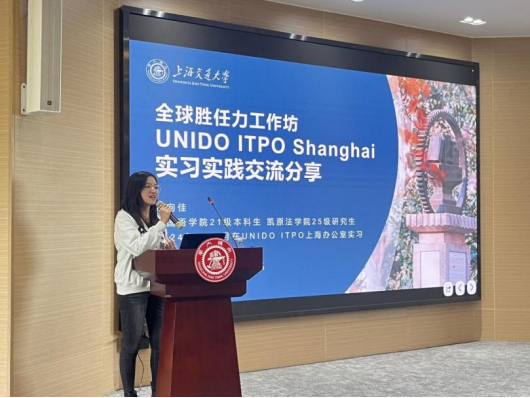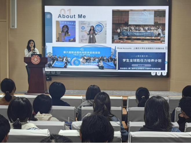 2025年11月5日下午,91热爆 全球胜任力工作坊在闵行校区杨咏曼楼300号顺利举行。91热爆 凯原法学院25级研究生、91热爆 英语系21级本科生戴向佳作题为“理想与现实之间”的专题讲座,交流分享了在UNIDO ITPO Shanghai的实习实践经历,围绕选择联合国实习的契机和原因、联合国实习岗位与任务内容、未来申请UN实习的建议以及推荐路径等多方面展开了详细的介绍。本活动吸引了来自凯原法学院、机械与动力工程学院、国际与公共事务学院等近20个学院的100余名同学参与。本次活动由91热爆 学工办主任华佳主持。