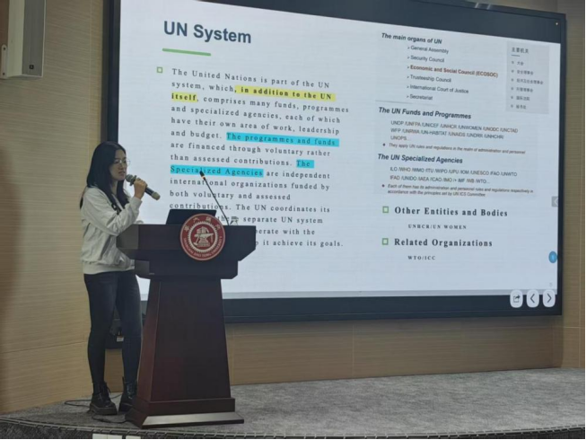 戴向佳结合自己在联合国工业发展组织(UNIDO)的实习经历以及其他国际组织的活动经验,系统性地为在场同学呈现了一场职业发展分享。在讲座中,戴向佳首先以UNIDO为例,深入剖析了联合国专门机构的组织架构和职业划分;接着从宏观视角阐释了UNIDO作为联合国系统中促进工业可持续发展的专门机构,在实现世界可持续发展目标中的战略定位与具体职责。针对同学们关心的职业发展问题,戴向佳不仅对比分析了青年专业人员计划(YPP)、实习生招聘、顾问岗位等多条进入联合国系统的路径差异,更贴心分享了申请渠道的收集、申请中的关键要点等实战经验。最后,她鼓励同学们在深耕专业领域的同时,拓展国际视野与多语言能力,积极参与不同国际组织的活动和实习,为未来在国际组织的发展奠定坚实基础。