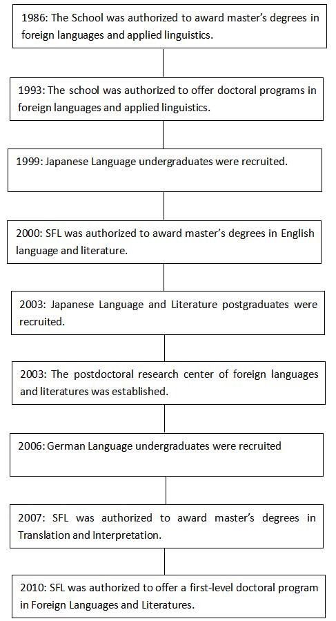 In 1997, the School of Foreign Languages was formally established. In 2000, it was able to award master’s degree in English language and literature. In 2003, the postdoctoral research center was set up. In 2007, as a pilot unit in China, SFL was authorized to award master’s degrees in Translation and Interpretation. In 2010, SFL was authorized to offer a first-level doctoral program in Foreign Languages and Literatures.