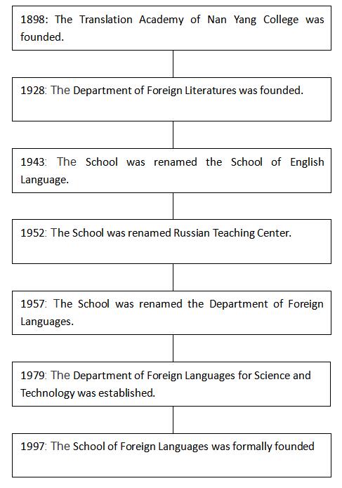 The history of foreign languages teaching in Shanghai Jiao Tong University (SJTU) dated back to the Translation Academy of Nan Yang College (currently SJTU), the first publishing and translation institution in modern China. In 1928, the Department of Foreign Literatures was founded. It was chaired by English expert Tang Qingyi, the eldest son of the former president of SJTU, Tang Wenzhi. The school was renamed in 1943 the School of English Languages, in 1952 the Russian Teaching Center, in September 1957 the Department of Foreign Languages, and in 1979, the Department of Foreign Languages for Science and Technology.