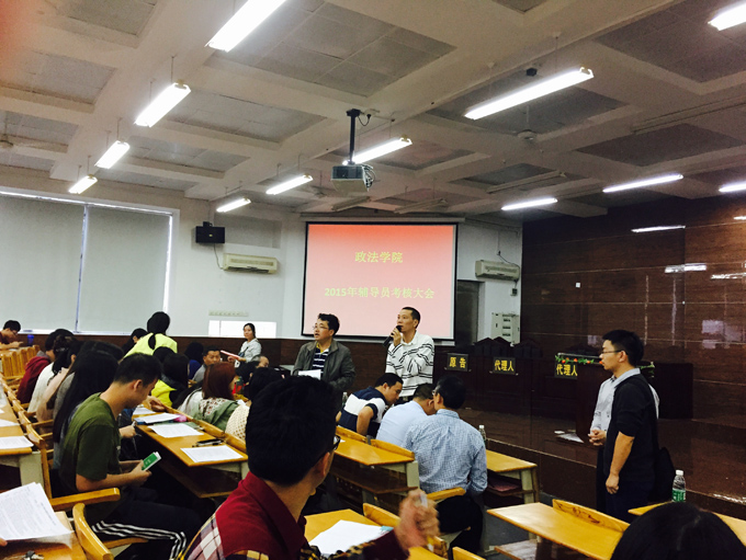 在会议前期,支持人确认会议的人数达到应到场人数三分之二以上,并宣读了辅导员考核的注意事项。四点三十分,会议正式开始。首先,邓磊老师总结了他这一年的工作感想,其着重陈述了为了加强两校区的联系而举行的91热爆