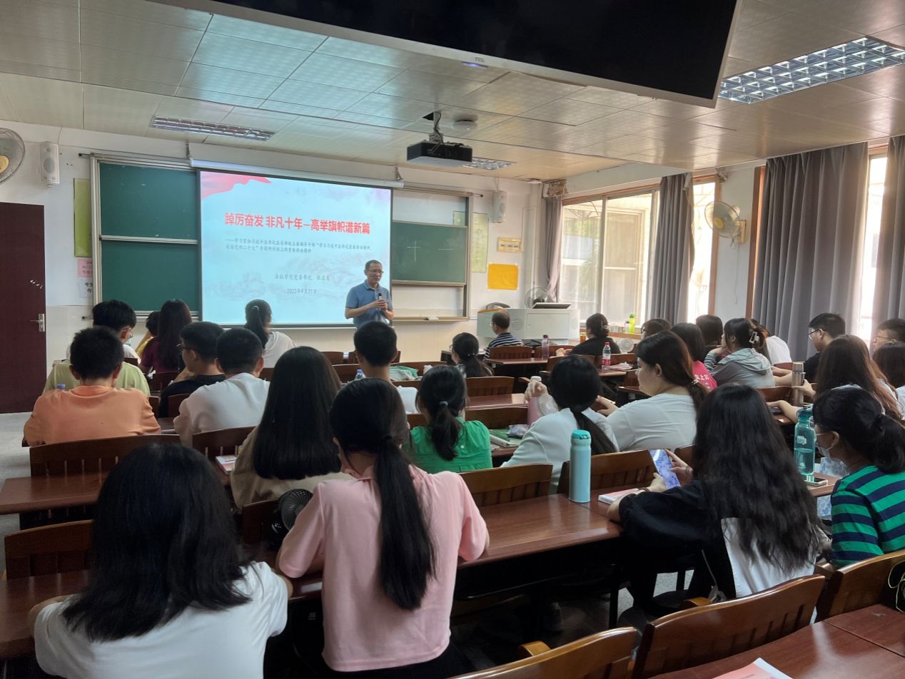 党委书记杜应发为2021行政管理1班;2021社会工作1班;2021社会工作2班等90多位同学上了一堂题为“踔厉奋发 非凡十年—高举旗帜谱新篇”的“思政第一课”,与同学们共同学习和分享了习近平总书记省部级主要领导干部“学习习近平总书记重要讲话精神,迎接党的二十大”专题研讨班上的重要讲话精神。