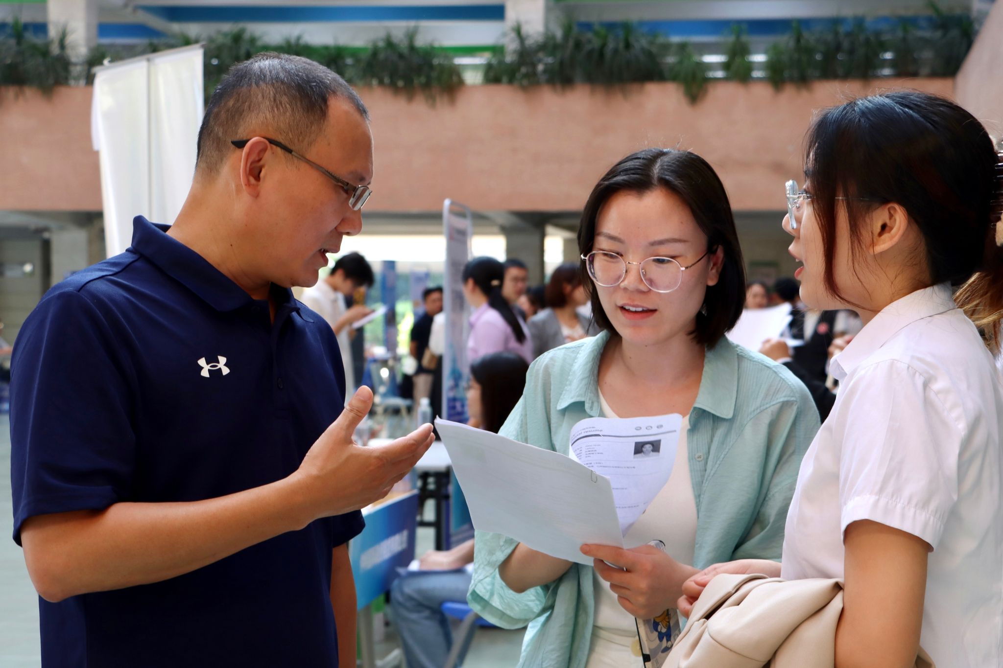 辅导员在招聘会现场及时提供就业指导服务,指导学生简历完善、为学生分析职业规划等。