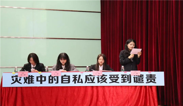 随后是大家期待已久的冠军赛。比赛开始后,正方就“灾难中的自私不利于灾情的救援”的观点,提出灾难中的自私带来的损人利己行为可能会加重灾情程度,不利于引导社会向好的价值观方向走。反方则提出“灾难中的自私是人们趋利避害的选择”,谴责无法达到根本遏制自私的效果,并会对受害者造成二次伤害。双方你来我往、各不相让,认真倾听对方辩诉的同时也思考着应付策略。比赛渐入佳境,现场掌声不断,气氛异常紧张。最后总结陈词环节,正反方辩手总结立证观点,以精辟的措辞、清晰的思路与巧妙的陈词相结合,给观众留下深刻印象。