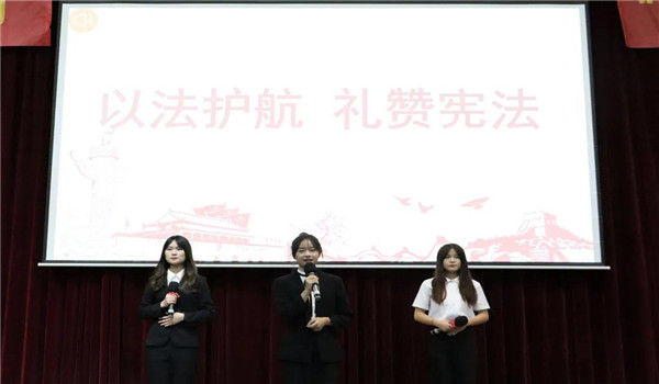 团委常务副书记李嘉怡、院学生会执行主席陈智慧和2020年宪法演讲比赛的一等奖获得者伍尚杰。