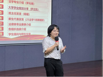 吉海荣在开场致辞中以“法学是施展才华、伸张正义的学科”点题,鼓励新生以热忱探索专业魅力。罗兆婧详细介绍了法学专业情况。作为广东省一流专业建设点,它不仅在往昔的校级评估中屡获佳绩,更在专业培养的道路上屡创辉煌,2023年更是以培养目标的高达成度,位居全校首位。罗兆婧深入浅出地剖析了专业人才培养的体系精髓,突显实践课程的亮点:社会调查实践巧妙搭建学术与比赛的桥梁,法律诊所实训借鉴德国式严谨思维,模拟法庭课程则以赛促学,让学生在实战中砥砺前行。谈及法考,她以亮眼的法考通过率数据给予我们信心与鼓舞,同时也不忘提醒,成绩的背后是汗水与坚持。此外,涉外法治方向卓越班的双语课程、特色美国法概论,以及拉美法律方向的规划,无不彰显着法学专业与大湾区发展同频共振的前瞻与魄力,让同学们对未来充满期待。