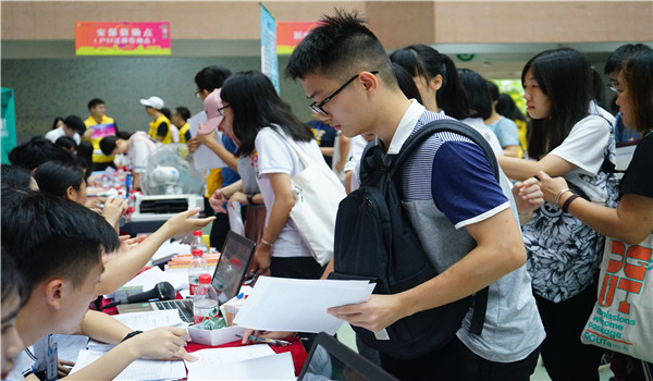 的迎新工作在四号楼大厅开展,2018级新生们即将开启他们的大学生活,展开人生新的篇章。