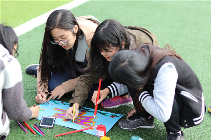 最后,同学们以宿舍为单位随机抽签,抽到了字样就开始自由发挥才能拿出准备好的卡纸、颜料和画笔,绘画出或者用手掌印拼出完整的“16社工一班”。