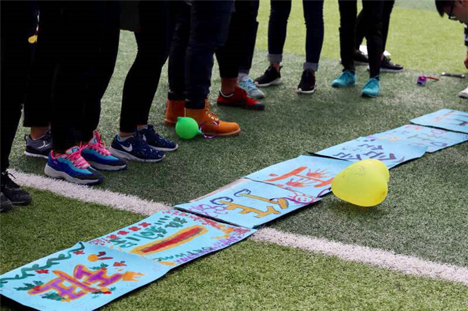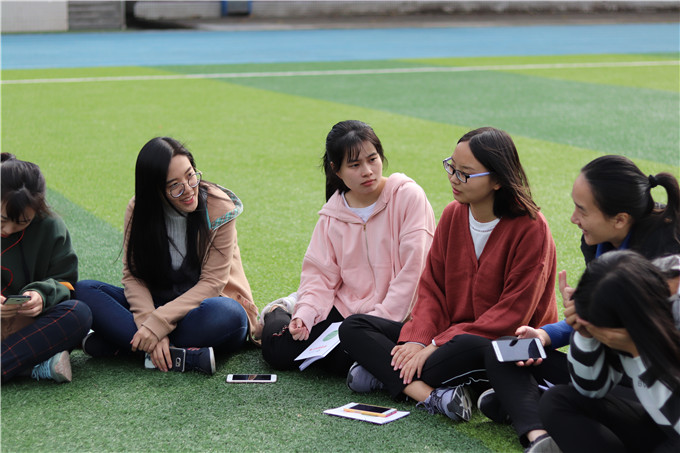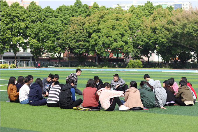 莞城校区假草足球场准时开展,全班同学在假草足球场的中央以围成圆圈并席地而坐的形式开展活动。