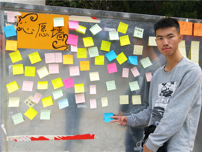 同学在心愿墙内拍照留念