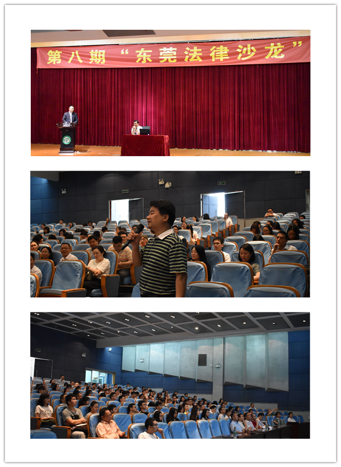 师生共三百余人聆听了讲座。讲座由东莞市律师协会会长陈锡康主持,东莞市人民检察院副检察长罗楚雄致辞。