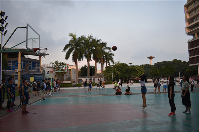 篮球赛决赛第一轮小组赛在图书馆后的篮球场举行。