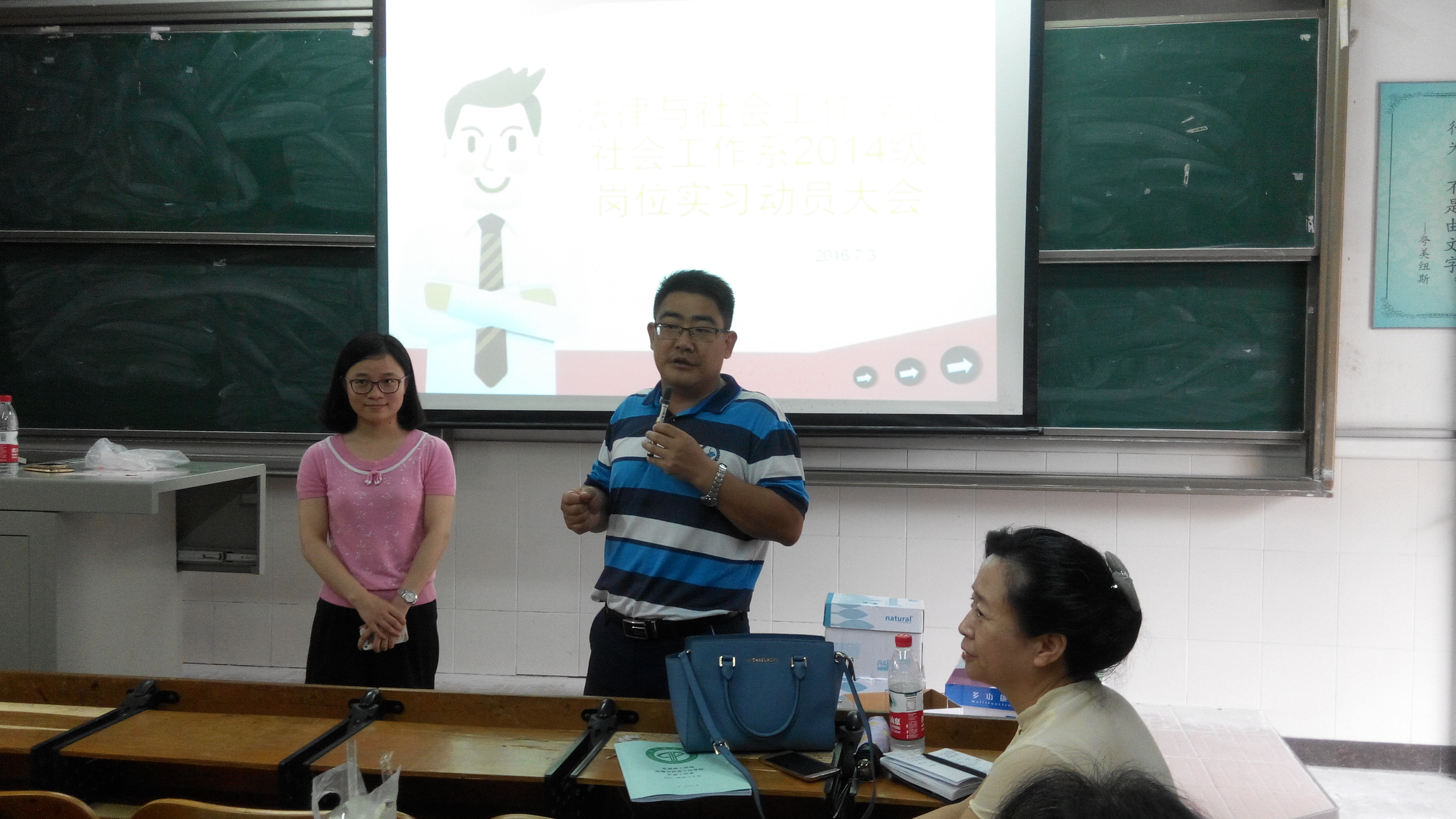 对社会工作系的关注和对同学们进行岗位实习工作的支持,并贴心提醒同学们在实习中要认真负责、勤奋好学,虚心请教、团队作业。除了要积极参与工作,还要注意人身安全,以自身安全为首位。接着,夏丽丽博士后分享了她的社会工作学习和实践经历,并与同学们进行简单的交流与互动。之后,系主任成伟教授向同学们阐述了社会工作系学生实习的基本情况和重要性,希望同学们能积极参与、用心实习、收获经验,也同样提出了实习期间同学们要注意安全的问题。