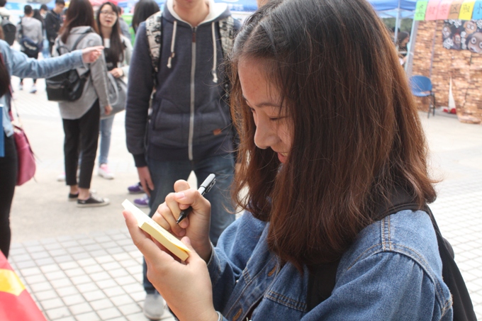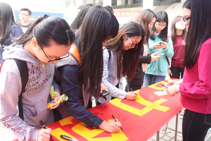 同学们在横幅上签名