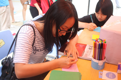 中午12:00,随着放学铃声的响起,全体干事快速到达一饭前空地后便开展了活动。在干事们的卖力宣传下,路过的同学们都深深地被本次的活动内容吸引了。在面具DIY区,同学们自己动手DIY属于自己独一无二的面具,同学们充分发挥了想象力,把原本空白的面具设计得独具特色,这一个个独具特色的面具为本次活动增添了不少色彩。在寄语区,同学们热情地为现读高三的师弟师妹们写下鼓励加油的话,一句句真诚的鼓励让人很窝心。收集好的寄语将会在11月21号给某中学的高三学子送去,相信在这些寄语的鼓励下,中学的高三学子一定能越战越勇,取得辉煌的成绩。