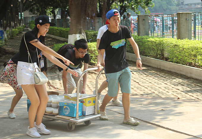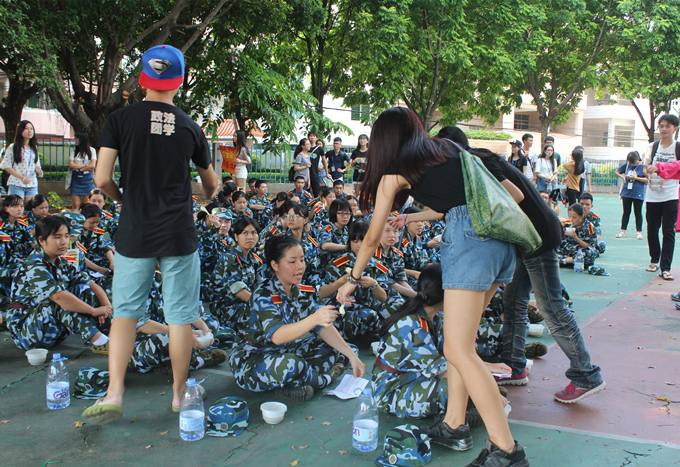 团学组织于莞城校区操场为大一军训新生送清凉——绿豆沙糖水。