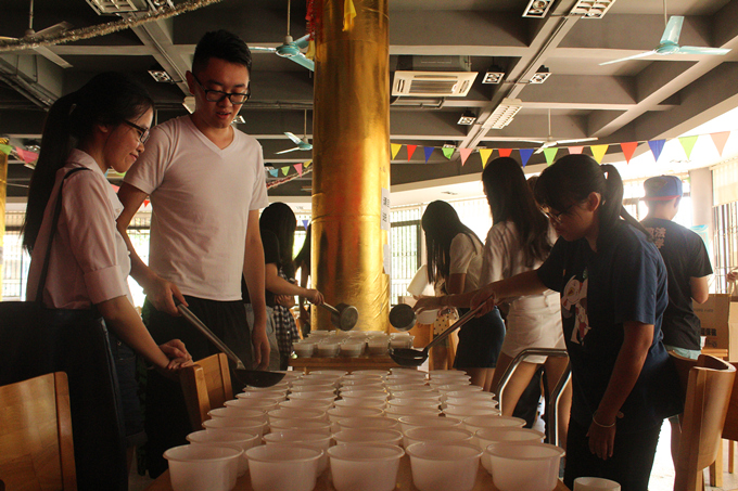 学生会及团总支委员们带上已购买好的食材,来到莞城校区教师饭堂,请食堂工作人员帮忙煮糖水。当糖水煮好后,政法团学人员待糖水盛凉、分装糖水,做好送清凉的准备工作。