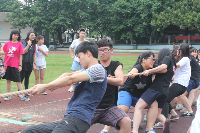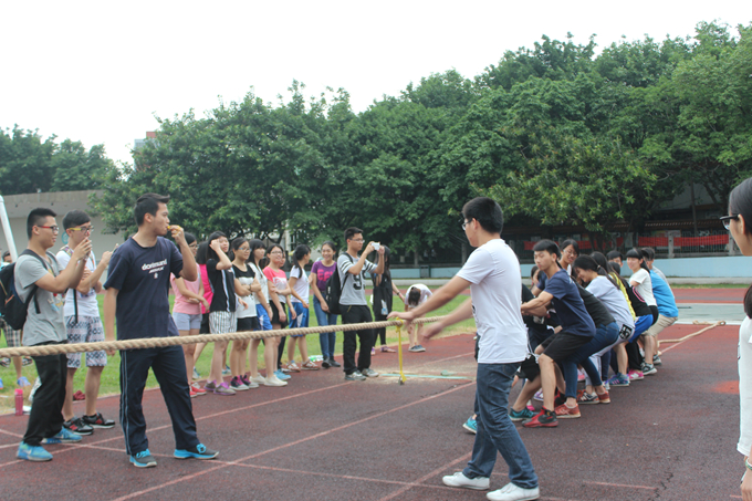 新生拔河比赛决赛在莞城校区运动场上举行。经过上一个星期预赛,4个班从激烈的角逐突围而出,它们分别是法学3班、行政管理1班、行政管理4班以及社会工作2班。