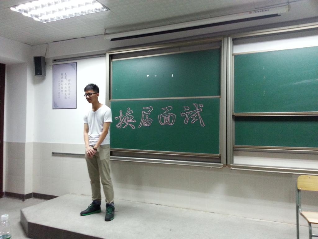 团总支在教学楼3401与3402教室集中进行了团总支换届面试,团总支各个部门的优秀成员纷纷竞选心中理想的职位。其中包括第二副书记,各部门部长、副部长等职位。作为这次面试官的常务副书记叶灏彬、秘书长莫玉兰、三位第二副书记以及各部门正副部长。面试分为两组来进行。竞选书记团和各部门部长的干事在3401进行面试,评委是书记团、秘书长和各部门部长。而在3402进行的是由各部门的副部长担任面试评委,干事对自己所属部门副部长的竞选面试。