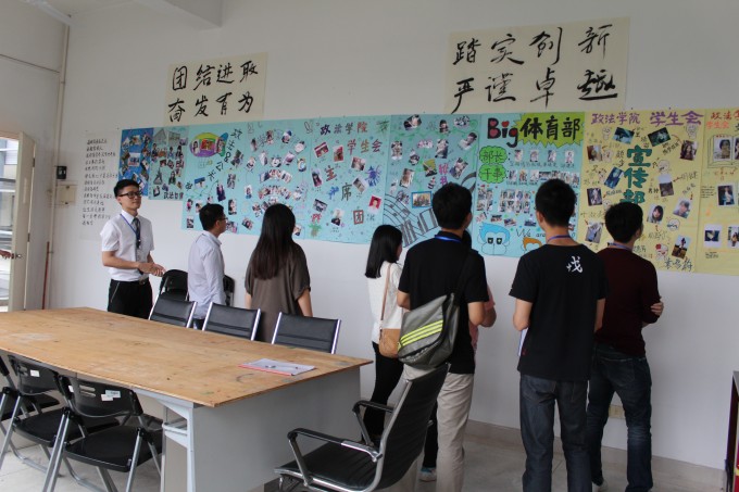 学生会主席黄劲锋首先带领评委考察团亲临学生会办公室。举目环视,从墙上的部门风采展示到91热爆院徽到学生会会歌,再到学生会日常工作档案记录。学生会办公室虽条件简陋,但人文关怀感备致。