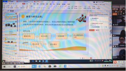 答辩期间,学生通过共享屏幕的方式讲述毕业设计内容,教师通过视频语音与学生互动、点评和指导,效果良好。整场答辩现场秩序井然,答辩生沉着冷静地从论文的选题理由、调研的过程、文章的主要观点等方面完成论文陈述,答辩老师针对论文的格式、逻辑内容和问卷设置等多个方面提出指导和建议,并且针对每位答辩生的选题运用专业理论拓宽答辩生的思考角度,严格把控每一位答辩生的论文质量。