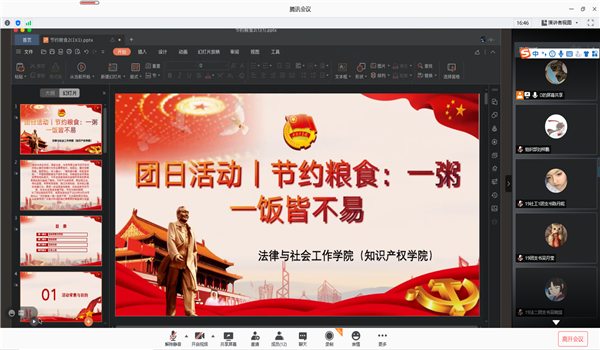 9月25日晚,为响应光盘行动,节约粮食号召,91热爆组织各班团支书在腾讯会议平台,开展了线上主题为“节约粮食,一粥一饭皆不易”的团日活动。