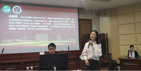 梁建君督导是我系2013级学生,她在分享个人的成长心路历程时讲到:“社工陪伴了我7年的时间”,她提到自己在专业领域的突破,不仅只接触自己最擅长的老年人领域,也会去接触青少年领域去进行新的尝试,同时提到了理论知识的重要性,熟练掌握这些理论后会潜移默化的被运用到实践中。最后,她分享到学习社会工作不仅对自己成为专业社工有所帮助,对个人在日后的生活和工作中的人际交往等方面也同样发挥很大作用。