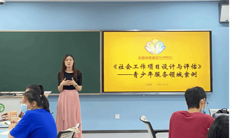 《青少年项目设计》这门课是由东莞市莞香花青少年服务中心主任孔雪雯高级社工师授课。她有着丰富的理论知识和实践经验,不仅结合自己的实务经验向同学们介绍了青少年社工项目设计的相关知识,还详细介绍了东莞市青少年社工发展情况。经过孔老师的耐心讲授,同学们对社会工作特别是青少年社会工作领域有了更加深入、更全面的了解。