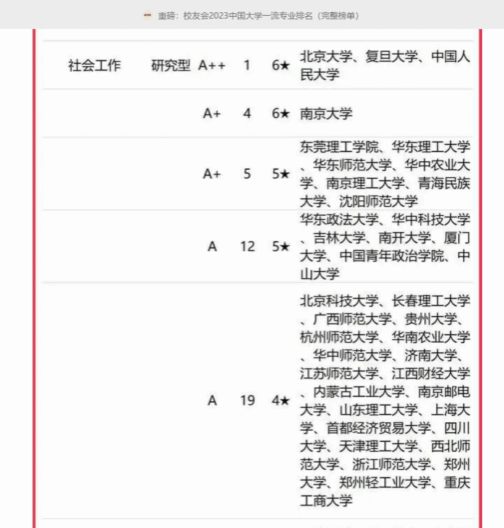 根据校友会2023年中国大学一流专业排名(完整榜单)显示,我校社会工作专业在全国研究型高校中位列第五名,仅次于北京大学、复旦大学、人民大学、南京大学,在广东省研究型社会工作专业院校中排名第一,超过中山大学、华南农业大学等省内名校。