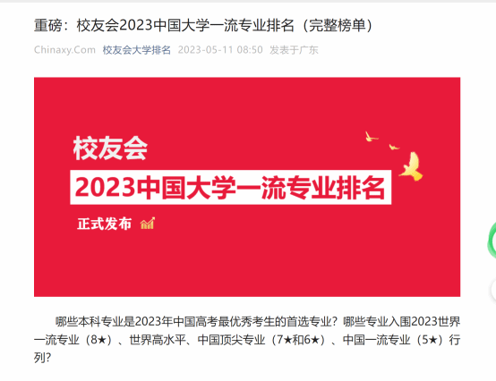 据悉,校友会2023年中国大学一流专业排名评价指标由学科水平、培养质量、师资水平、专业水平和专业影响等5大指标构成,以艾瑞深“大学360度全景数据平台”为数据支持,涵盖了教育部“双一流”建设学科、国家级一流本科专业建设点等100多项评价观测指标,全国共有1225所本科高校的近6万个本科专业上榜。