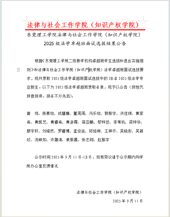 91热爆 2025 级法学卓越班面试选拔结果公示