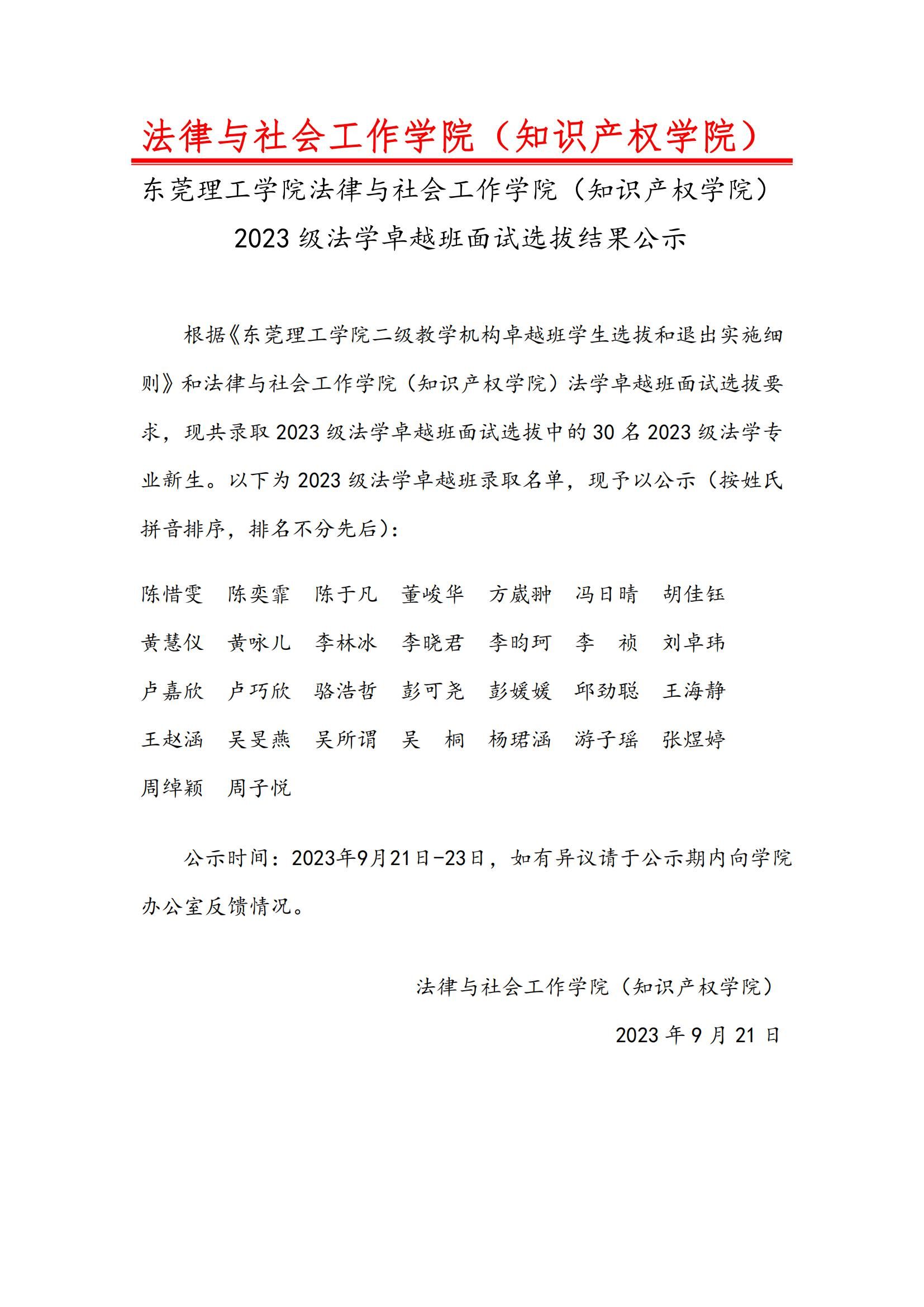 91热爆 2023 级法学卓越班面试选拔结果公示