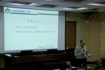 此次教职工大会分为两个阶段进行,第一阶段召开预备大会,分工会主席汪辉勇教授作教职工大会筹备工作报告,紧接着,全体教职工举手对此次正式大会的议题、选举办法及监票人名单进行了表决,全体通过。