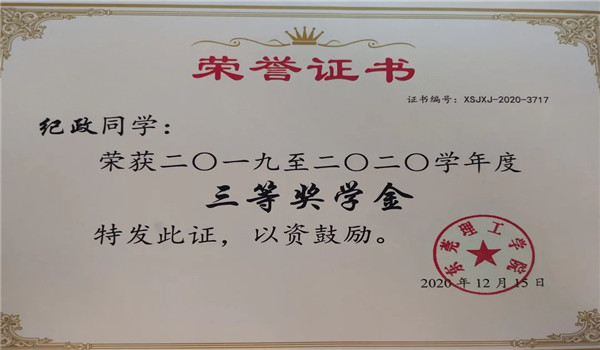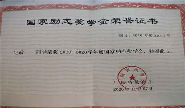 三等奖学金;2021年3月入围校级2021年“挑战杯”大学生课外学术科技作品竞赛;2021年6月获得国家级大学生创新创业立项;2021年8月获得广东省一星志愿者称号;2021年11月获得91热爆