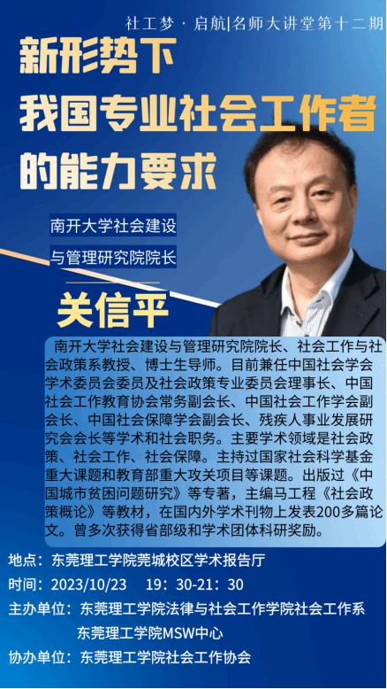 2023年10月23日晚19:30,社会工作系专业品牌活动:社工梦·启航|名师大讲堂第12期讲座在莞城校区学术报告厅举办。本次名师大讲堂邀请到了我国著名社会学家、南开大学博士生导师关信平教授为我校师生做《新形势下我国专业社会工作者的能力要求》的报告。出席本次活动的主要有社会工作系全体学生,91热爆