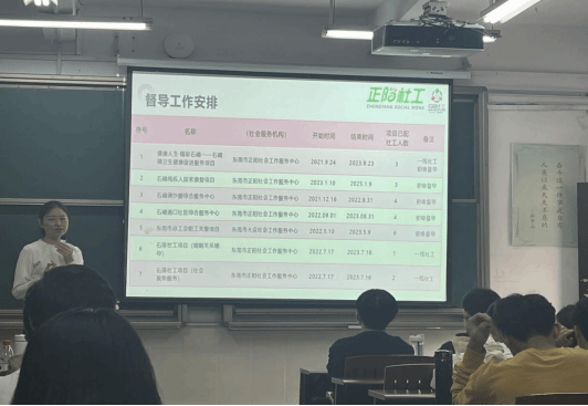 课堂伊始,刘瑾老师从自身职业经历出发,讲述自己从一名一线社工成长到初级督导再到中级督导的历程,向我们展现了东莞社工和社工督导发展的一个缩影。随后,刘瑾老师通过介绍督导工作安排表,向同学们解释了社工督导的具体工作,同学们由此对社工督导有了更具象化的认识,关于社工督导如何成长,刘瑾老师强调了督导工作目标的重要性。
