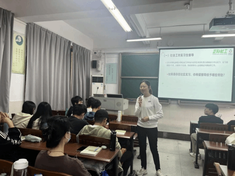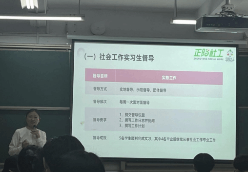 刘瑾老师从事社会督导工作多年,有着丰富的督导经验。在课堂上,她以“社会工作督导实务分享”为主题,从社会工作督导成长历程、社会工作督导具备的能力、社会工作督导效果评估和社会工作督导伦理、社会工作督导实务案例这五个方面跟同学们进行了分享和交流。