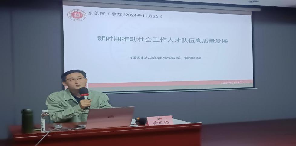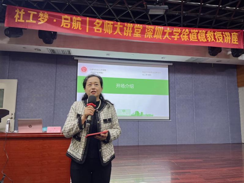 教授、博士生导师徐道稳教授为我校师生做《新时期推动社会工作人才队伍高质量发展》的学术报告,活动由社会工作系主任成伟教授主持。