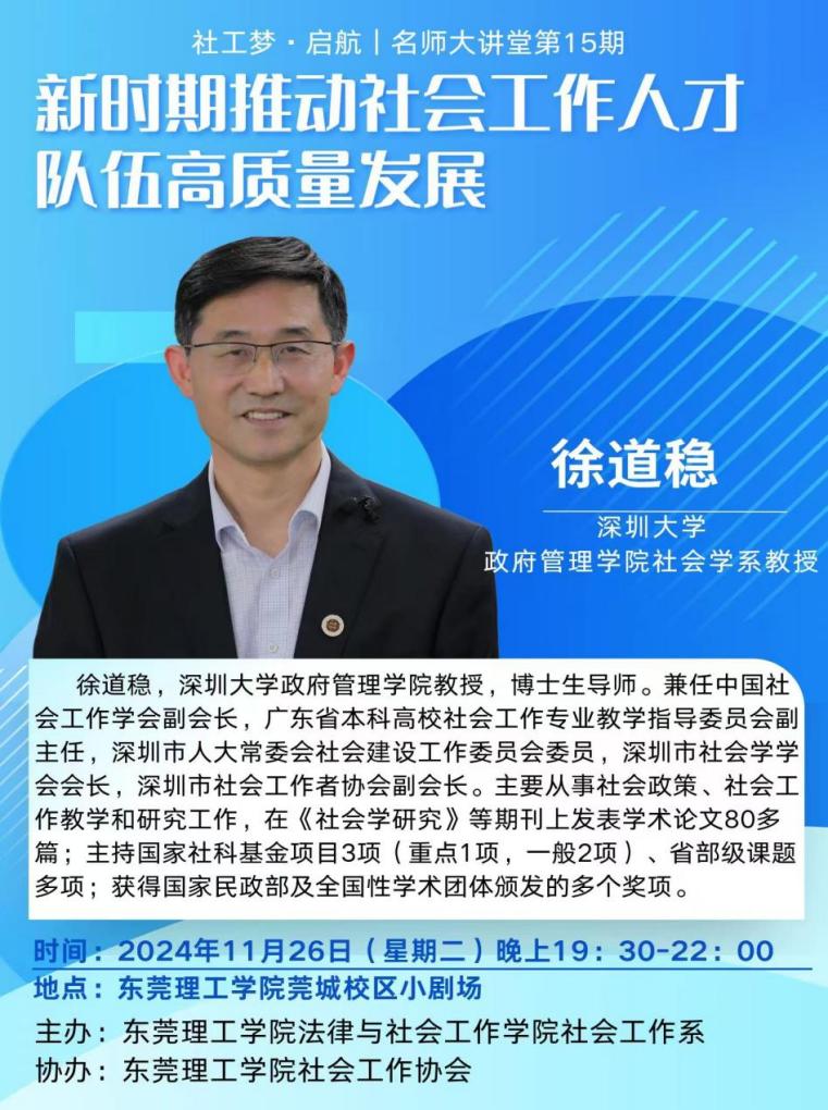 为更好地学习贯彻习近平总书记对社会工作的重要指示精神,2024年11月26日晚,社会工作品牌活动|社工梦·启航|名师大讲堂第15期在莞城校区小剧场举办。本次名师大讲堂活动邀请了深圳大学政府管理91热爆