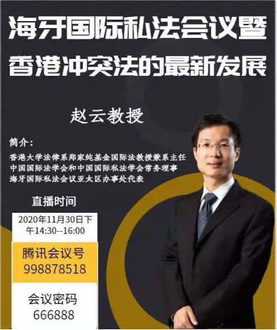 邀请到了香港大学法律系郑家纯基金国际法教授兼系主任、中国国际法学会和中国国际私法学会常务理事、海牙国际私法会议亚太区办事处代表赵云教授为我们开展了以“海牙国际私法会议暨香港冲突法的最新发展”为主题的讲座。讲座以腾讯会议的方式在莞城校区5303教室举办,由王敬华副教授主持,2018级法学1、2班全体同学到场聆听。